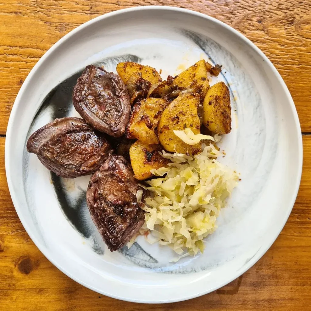 This is wild meat at its finest, not so gamey, very tasty, a good source of natural protein, potatoes cooked the traditional way, and sauerkraut for vitamin c and digestive power